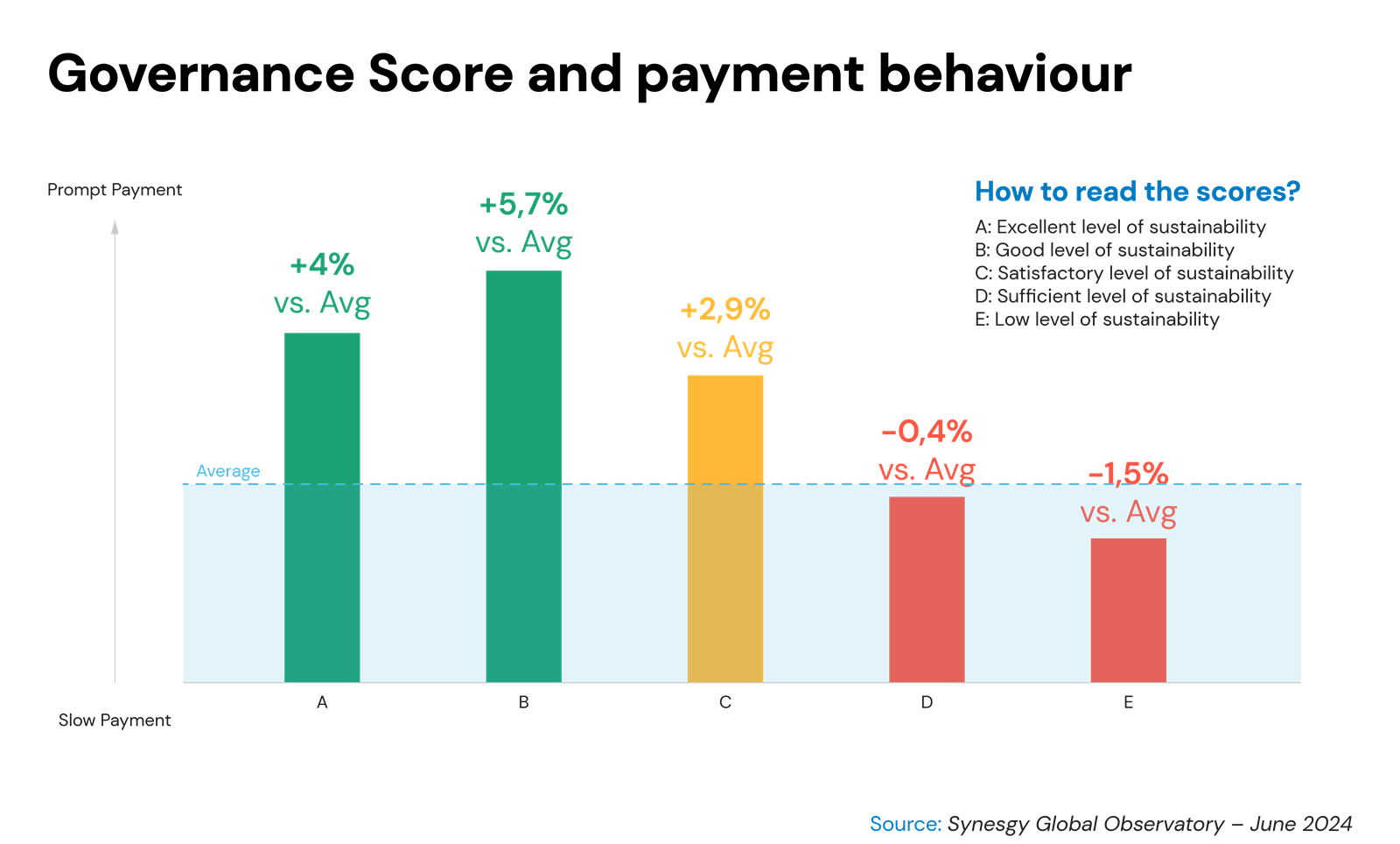 A key finding of the Synesgy Global Observatory is the relationship between a company's Governance (G) score, one of the key ESG components, and its payment behaviour.